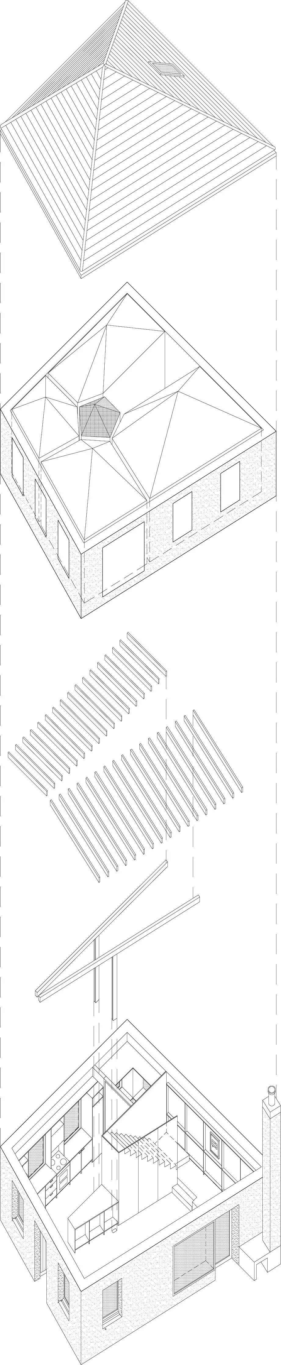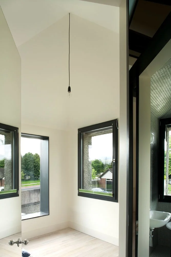 a new-build house located in a suburban estate. the materials of the surrounding houses are re-used but articulated in an alternative manner. internally the communal spaces are lined in birch ply fitted furniture. the bedrooms are lined in plasterboard, with individual pitched ceilings. the 1st floor landing space is lined in mirror.
