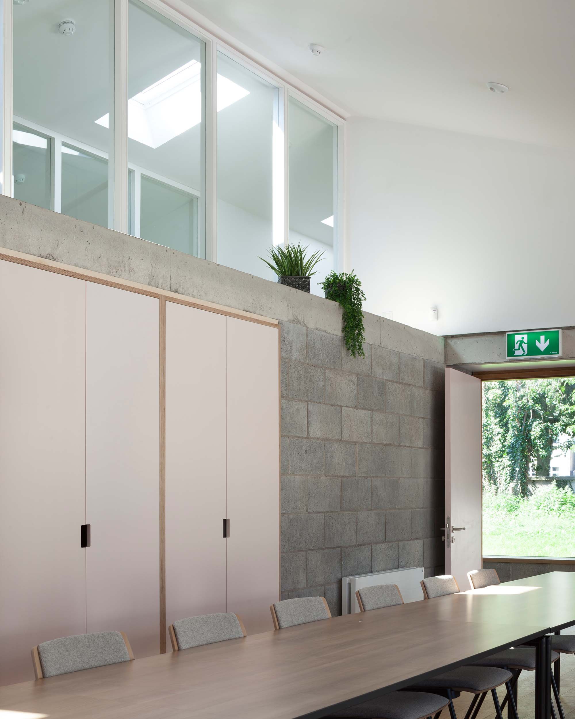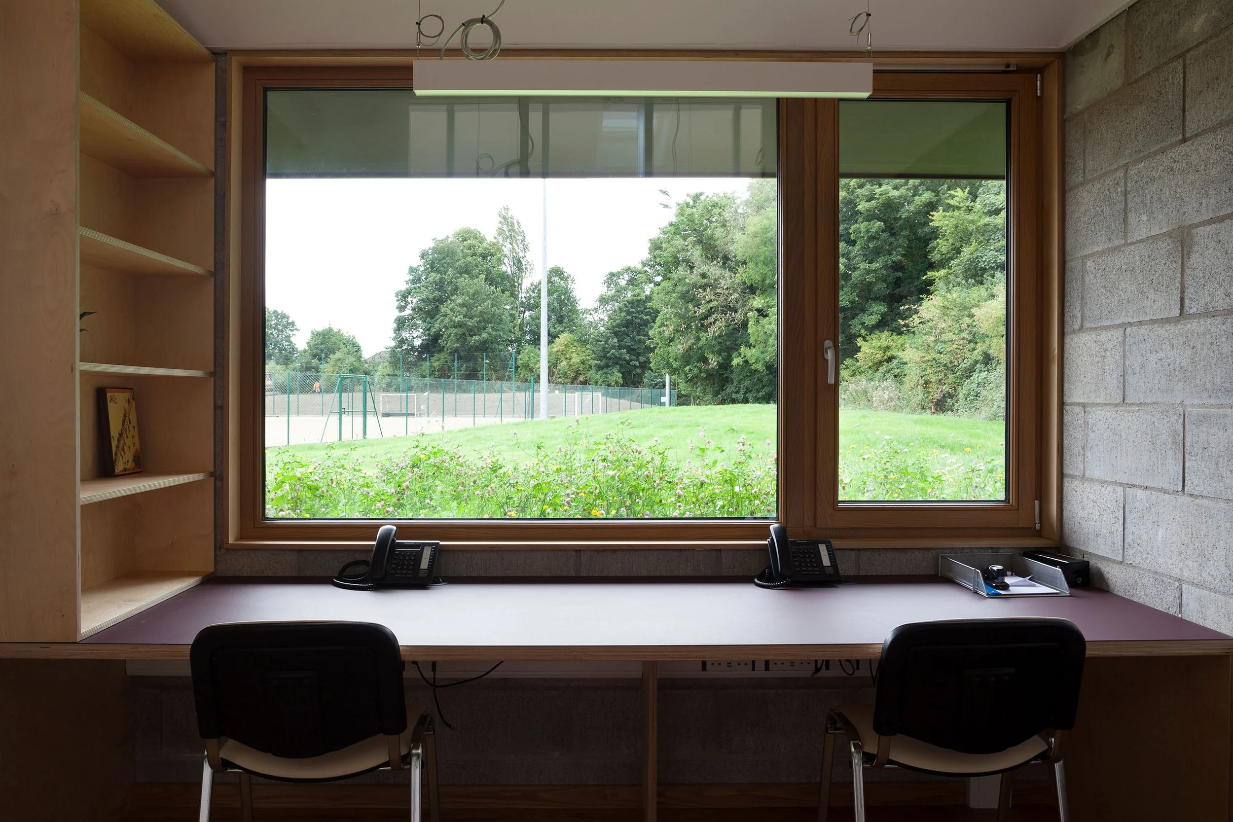 the office spaces overlook the first garden - a raised bed of wildflower, which foregrounds an expansive view over the school grounds. the large meeting room (which doubles as a reflective gathering space for the trust community) addresses the second garden - an introverted courtyard, backgrounded by the mature trees outside.