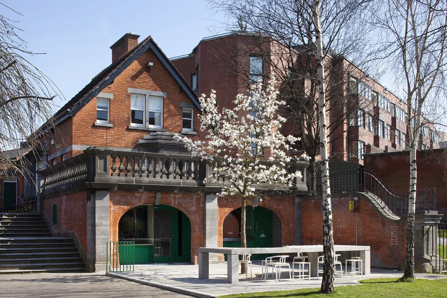a new tearoom and public toilets were inserted into existing storage spaces behind the historic arches. all new interventions into the historic fabric are carried out in bespoke steelwork elements. a new terrace outside features a 5m long communal table set underneath a magnolia tree.