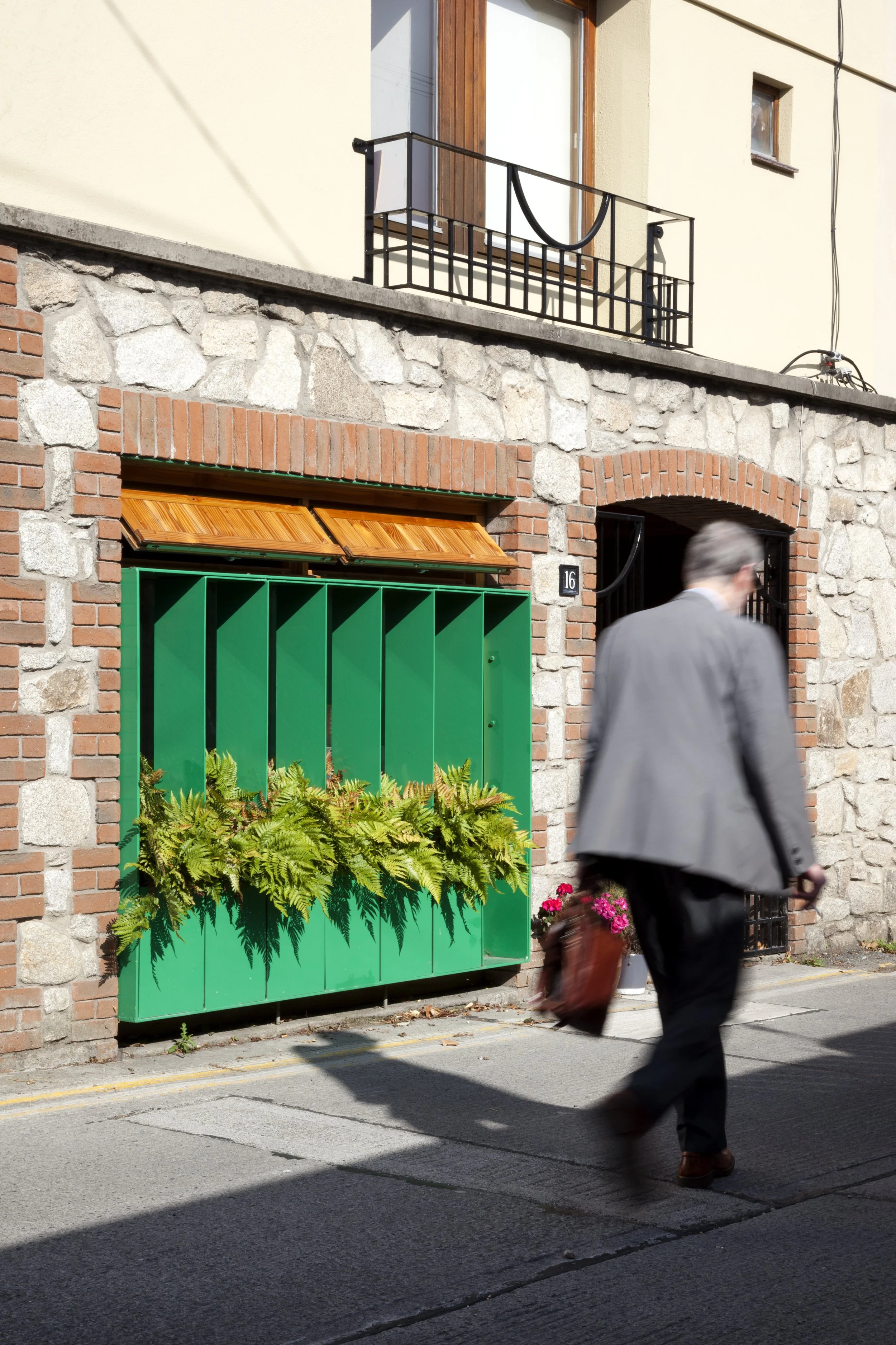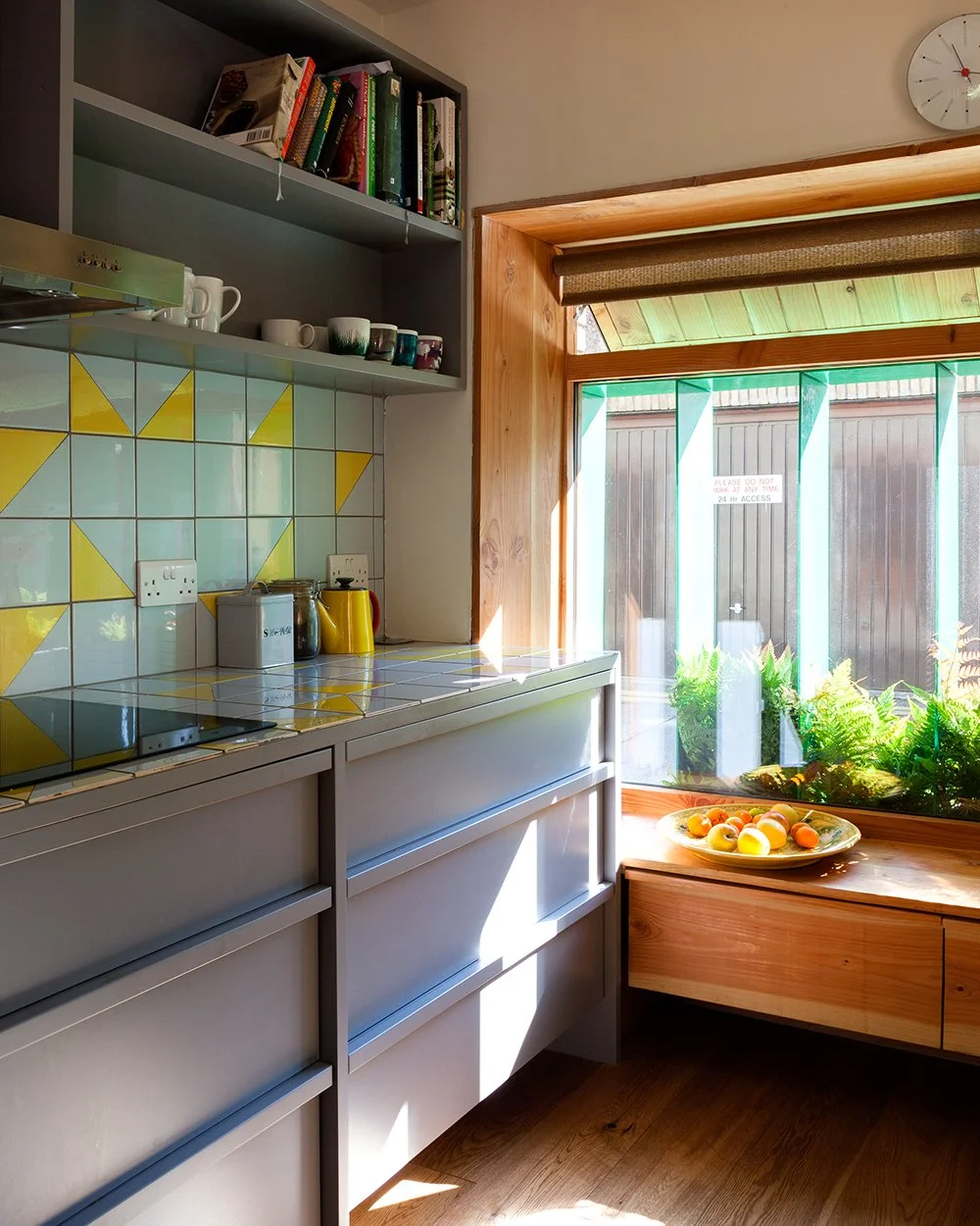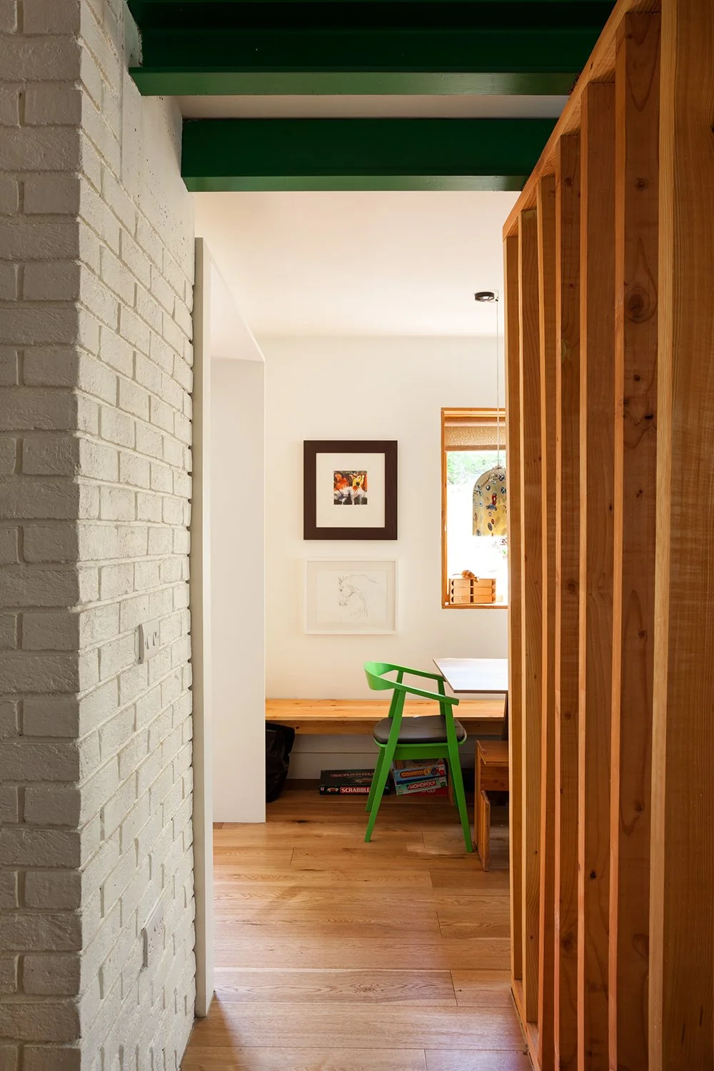 a series of new screens are placed within an existing mews house. a garage door is replaced with a planted screen to make a window onto the lane for a new kitchen. sliding doors are replaced with a bespoke window which looks up towards the mature trees beyond. a small utility shed in the rear garden is faced in mirror to double the planting to the small town garden.